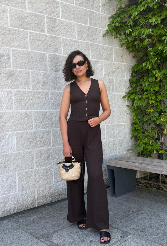 Brown Comfort Set Top with Gold Buckle & wide-leg Pants