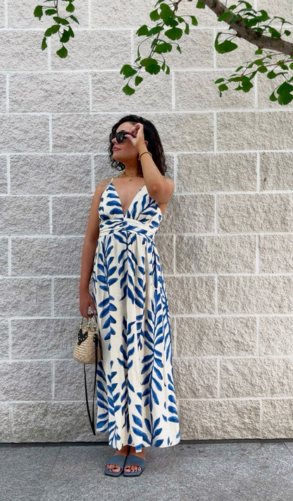 Robe longue imprimé feuille crème et bleu