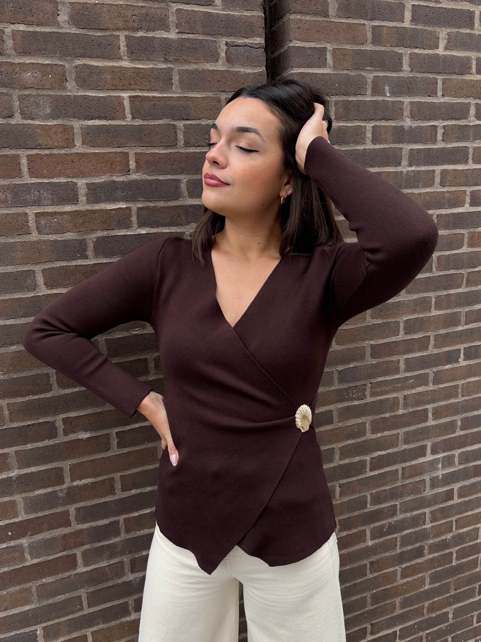 Pull marron cache coeur détail coquillage doré